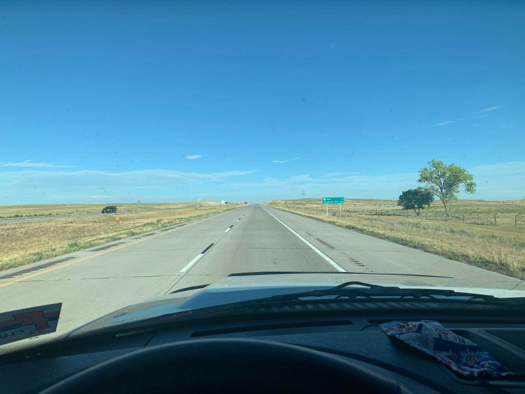 Once I left Lincoln, I caught up with I-80 and began the long trek westward across Nebraska. As the light of dawn began and the plains rose higher upward, my body surged with excitement and expectation—as well as the effects of elevation increasing. Finally, the digital map in my car’s front console showed the red arrow near Wyoming.